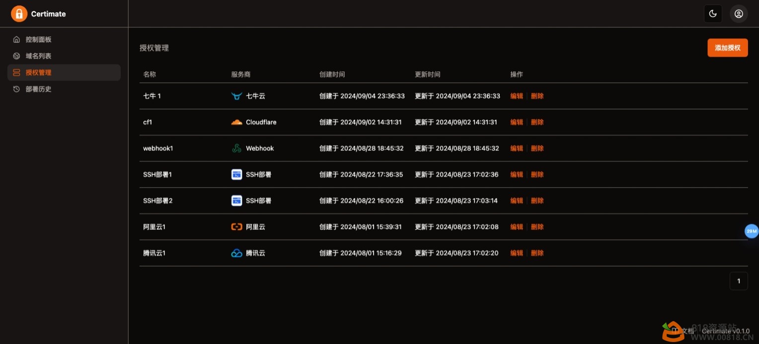1、用户通过 Certimate 管理页面填写申请证书的信息,包括域名、DNS 服务商的授权信息、以及要部署到的服务商的授权信息。